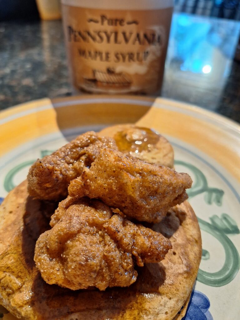 And it probably isn’t any surprise to you, but we would ALSO recommend topping your chicken and waffles with maple syrup from PA Lamb Farm. 😀