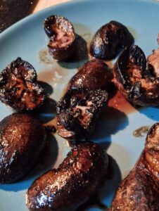 If I were to make these again, I think I might do a better job of blotting the kidneys before cooking them or perhaps marinate with a different vinegar. The balsamic flavor was a little strong for my liking.